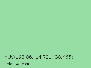 YUV 193.86,-14.721,-38.465 Color is a light green color and the nearest color is Teal Deer #99e6b3. Hex code #96dea4 and RGB value is rgb(150,222,164). In RGB color space, this color is composed of 59% red, 87% green, 64% blue, In CMYK color space, this color is composed of 32% cyan, 0% magenta, 26% yellow , 13% black , In HSL color space, this color has a hue angle of 132° , 52% saturation and 73% lightness.