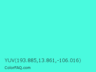 YUV 193.885,13.861,-106.016 Color is a light cyan color and the nearest color is Turquoise #40e0d0. Hex code #49fade and RGB value is rgb(73,250,222). In RGB color space, this color is composed of 29% red, 98% green, 87% blue, In CMYK color space, this color is composed of 71% cyan, 0% magenta, 11% yellow , 2% black , In HSL color space, this color has a hue angle of 171° , 95% saturation and 63% lightness.