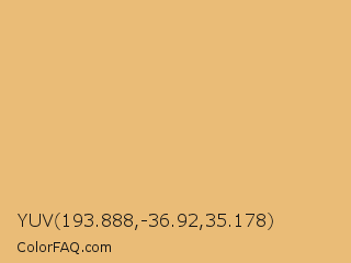 YUV 193.888,-36.92,35.178 Color is a light orange color and the nearest color is Rob Roy #eac674. Hex code #eabc77 and RGB value is rgb(234,188,119). In RGB color space, this color is composed of 92% red, 74% green, 47% blue, In CMYK color space, this color is composed of 0% cyan, 20% magenta, 49% yellow , 8% black , In HSL color space, this color has a hue angle of 36° , 73% saturation and 69% lightness.