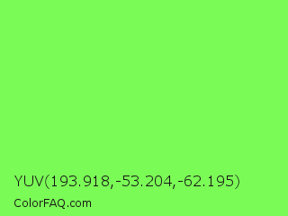 YUV 193.918,-53.204,-62.195 Color is a light green color and the nearest color is Screamin Green #66ff66. Hex code #7bfb56 and RGB value is rgb(123,251,86). In RGB color space, this color is composed of 48% red, 98% green, 34% blue, In CMYK color space, this color is composed of 51% cyan, 0% magenta, 66% yellow , 2% black , In HSL color space, this color has a hue angle of 107° , 95% saturation and 66% lightness.