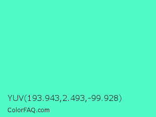 YUV 193.943,2.493,-99.928 Color is a light green color and the nearest color is Turquoise #40e0d0. Hex code #50fbc7 and RGB value is rgb(80,251,199). In RGB color space, this color is composed of 31% red, 98% green, 78% blue, In CMYK color space, this color is composed of 68% cyan, 0% magenta, 21% yellow , 2% black , In HSL color space, this color has a hue angle of 162° , 96% saturation and 65% lightness.