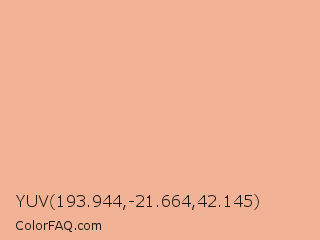 YUV 193.944,-21.664,42.145 Color is a light orange color and the nearest color is Rose Bud #fbb2a3. Hex code #f2b296 and RGB value is rgb(242,178,150). In RGB color space, this color is composed of 95% red, 70% green, 59% blue, In CMYK color space, this color is composed of 0% cyan, 26% magenta, 38% yellow , 5% black , In HSL color space, this color has a hue angle of 18° , 78% saturation and 77% lightness.