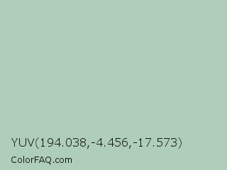 YUV 194.038,-4.456,-17.573 Color is a light green color and the nearest color is Spring Rain #accbb1. Hex code #aeceb9 and RGB value is rgb(174,206,185). In RGB color space, this color is composed of 68% red, 81% green, 73% blue, In CMYK color space, this color is composed of 16% cyan, 0% magenta, 10% yellow , 19% black , In HSL color space, this color has a hue angle of 141° , 25% saturation and 75% lightness.