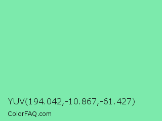 YUV 194.042,-10.867,-61.427 Color is a light green color and the nearest color is Medium Aquamarine #66ddaa. Hex code #7ceaac and RGB value is rgb(124,234,172). In RGB color space, this color is composed of 49% red, 92% green, 67% blue, In CMYK color space, this color is composed of 47% cyan, 0% magenta, 26% yellow , 8% black , In HSL color space, this color has a hue angle of 146° , 72% saturation and 70% lightness.