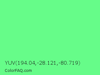 YUV 194.04,-28.121,-80.719 Color is a light green color and the nearest color is Very Light Malachite Green #64e986. Hex code #66fc89 and RGB value is rgb(102,252,137). In RGB color space, this color is composed of 40% red, 99% green, 54% blue, In CMYK color space, this color is composed of 60% cyan, 0% magenta, 46% yellow , 1% black , In HSL color space, this color has a hue angle of 134° , 96% saturation and 69% lightness.