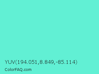 YUV 194.051,8.849,-85.114 Color is a light cyan color and the nearest color is Turquoise Blue #6cdae7. Hex code #61f0d4 and RGB value is rgb(97,240,212). In RGB color space, this color is composed of 38% red, 94% green, 83% blue, In CMYK color space, this color is composed of 60% cyan, 0% magenta, 12% yellow , 6% black , In HSL color space, this color has a hue angle of 168° , 83% saturation and 66% lightness.