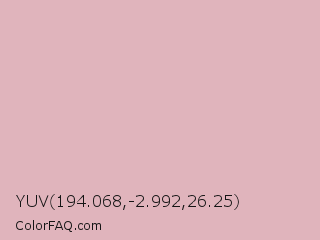 YUV 194.068,-2.992,26.25 Color is a light red color and the nearest color is Blossom #dcb4bc. Hex code #e0b4bc and RGB value is rgb(224,180,188). In RGB color space, this color is composed of 88% red, 71% green, 74% blue, In CMYK color space, this color is composed of 0% cyan, 20% magenta, 16% yellow , 12% black , In HSL color space, this color has a hue angle of 349° , 42% saturation and 79% lightness.
