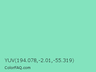 YUV 194.078,-2.01,-55.319 Color is a light green color and the nearest color is Pearl Aqua #88d8c0. Hex code #83e3be and RGB value is rgb(131,227,190). In RGB color space, this color is composed of 51% red, 89% green, 75% blue, In CMYK color space, this color is composed of 42% cyan, 0% magenta, 16% yellow , 11% black , In HSL color space, this color has a hue angle of 157° , 63% saturation and 70% lightness.