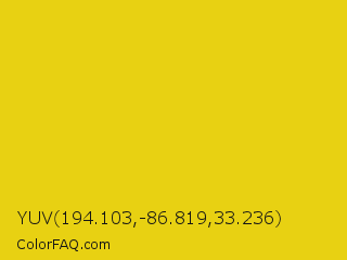 YUV 194.103,-86.819,33.236 Color is a normal yellow color and the nearest color is Citrine #e4d00a. Hex code #e8d112 and RGB value is rgb(232,209,18). In RGB color space, this color is composed of 91% red, 82% green, 7% blue, In CMYK color space, this color is composed of 0% cyan, 10% magenta, 92% yellow , 9% black , In HSL color space, this color has a hue angle of 54° , 86% saturation and 49% lightness.