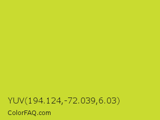 YUV 194.124,-72.039,6.03 Color is a normal yellow color and the nearest color is Pear #d1e231. Hex code #c9db30 and RGB value is rgb(201,219,48). In RGB color space, this color is composed of 79% red, 86% green, 19% blue, In CMYK color space, this color is composed of 8% cyan, 0% magenta, 78% yellow , 14% black , In HSL color space, this color has a hue angle of 66° , 70% saturation and 52% lightness.