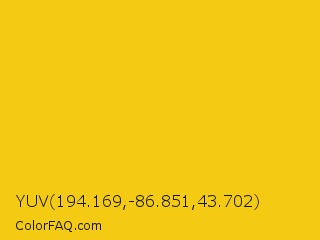 YUV 194.169,-86.851,43.702 Color is a normal yellow color and the nearest color is Jonquil #f4ca16. Hex code #f4cb12 and RGB value is rgb(244,203,18). In RGB color space, this color is composed of 96% red, 80% green, 7% blue, In CMYK color space, this color is composed of 0% cyan, 17% magenta, 93% yellow , 4% black , In HSL color space, this color has a hue angle of 49° , 91% saturation and 51% lightness.
