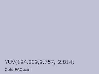 YUV 194.209,9.757,-2.814 Color is a light blue color and the nearest color is Blue Haze #bfbed8. Hex code #bfc0d6 and RGB value is rgb(191,192,214). In RGB color space, this color is composed of 75% red, 75% green, 84% blue, In CMYK color space, this color is composed of 11% cyan, 10% magenta, 0% yellow , 16% black , In HSL color space, this color has a hue angle of 237° , 22% saturation and 79% lightness.