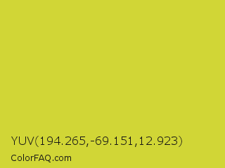 YUV 194.265,-69.151,12.923 Color is a normal yellow color and the nearest color is Pear #d1e231. Hex code #d1d636 and RGB value is rgb(209,214,54). In RGB color space, this color is composed of 82% red, 84% green, 21% blue, In CMYK color space, this color is composed of 2% cyan, 0% magenta, 75% yellow , 16% black , In HSL color space, this color has a hue angle of 62° , 66% saturation and 53% lightness.