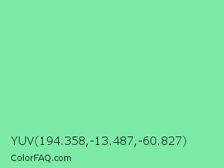YUV 194.358,-13.487,-60.827 Color is a light green color and the nearest color is Medium Aquamarine #66ddaa. Hex code #7deba7 and RGB value is rgb(125,235,167). In RGB color space, this color is composed of 49% red, 92% green, 65% blue, In CMYK color space, this color is composed of 47% cyan, 0% magenta, 29% yellow , 8% black , In HSL color space, this color has a hue angle of 143° , 73% saturation and 71% lightness.