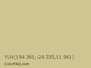 YUV 194.361,-24.335,11.961 Color is a light yellow color and the nearest color is Yuma #cec291. Hex code #d0c591 and RGB value is rgb(208,197,145). In RGB color space, this color is composed of 82% red, 77% green, 57% blue, In CMYK color space, this color is composed of 0% cyan, 5% magenta, 30% yellow , 18% black , In HSL color space, this color has a hue angle of 50° , 40% saturation and 69% lightness.