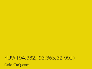 YUV 194.382,-93.365,32.991 Color is a normal yellow color and the nearest color is Safety Yellow #eed202. Hex code #e8d405 and RGB value is rgb(232,212,5). In RGB color space, this color is composed of 91% red, 83% green, 2% blue, In CMYK color space, this color is composed of 0% cyan, 9% magenta, 98% yellow , 9% black , In HSL color space, this color has a hue angle of 55° , 96% saturation and 46% lightness.