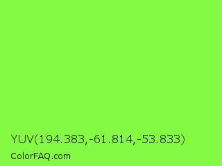 YUV 194.383,-61.814,-53.833 Color is a light green color and the nearest color is Kiwi #8ee53f. Hex code #85fa45 and RGB value is rgb(133,250,69). In RGB color space, this color is composed of 52% red, 98% green, 27% blue, In CMYK color space, this color is composed of 47% cyan, 0% magenta, 72% yellow , 2% black , In HSL color space, this color has a hue angle of 99° , 95% saturation and 63% lightness.