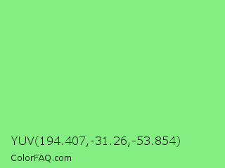 YUV 194.407,-31.26,-53.854 Color is a light green color and the nearest color is Light Green #90ee90. Hex code #85ee83 and RGB value is rgb(133,238,131). In RGB color space, this color is composed of 52% red, 93% green, 51% blue, In CMYK color space, this color is composed of 44% cyan, 0% magenta, 45% yellow , 7% black , In HSL color space, this color has a hue angle of 119° , 76% saturation and 72% lightness.