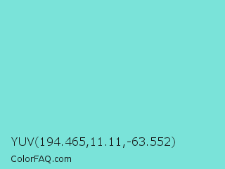 YUV 194.465,11.11,-63.552 Color is a light cyan color and the nearest color is Aquamarine Blue #71d9e2. Hex code #7ae3d9 and RGB value is rgb(122,227,217). In RGB color space, this color is composed of 48% red, 89% green, 85% blue, In CMYK color space, this color is composed of 46% cyan, 0% magenta, 4% yellow , 11% black , In HSL color space, this color has a hue angle of 174° , 65% saturation and 68% lightness.