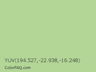 YUV 194.527,-22.938,-16.248 Color is a light green color and the nearest color is Feijoa #9fdd8c. Hex code #b0d594 and RGB value is rgb(176,213,148). In RGB color space, this color is composed of 69% red, 84% green, 58% blue, In CMYK color space, this color is composed of 17% cyan, 0% magenta, 31% yellow , 16% black , In HSL color space, this color has a hue angle of 94° , 44% saturation and 71% lightness.