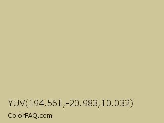 YUV 194.561,-20.983,10.032 Color is a light yellow color and the nearest color is Yuma #cec291. Hex code #cec598 and RGB value is rgb(206,197,152). In RGB color space, this color is composed of 81% red, 77% green, 60% blue, In CMYK color space, this color is composed of 0% cyan, 4% magenta, 26% yellow , 19% black , In HSL color space, this color has a hue angle of 50° , 36% saturation and 70% lightness.