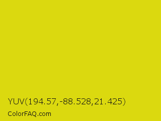 YUV 194.57,-88.528,21.425 Color is a normal yellow color and the nearest color is Barberry #ded717. Hex code #dbd90f and RGB value is rgb(219,217,15). In RGB color space, this color is composed of 86% red, 85% green, 6% blue, In CMYK color space, this color is composed of 0% cyan, 1% magenta, 93% yellow , 14% black , In HSL color space, this color has a hue angle of 59° , 87% saturation and 46% lightness.
