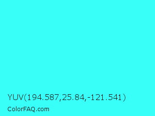 YUV 194.587,25.84,-121.541 Color is a light cyan color and the nearest color is Loeen #15f2fd. Hex code #38fff7 and RGB value is rgb(56,255,247). In RGB color space, this color is composed of 22% red, 100% green, 97% blue, In CMYK color space, this color is composed of 78% cyan, 0% magenta, 3% yellow , 0% black , In HSL color space, this color has a hue angle of 178° , 100% saturation and 61% lightness.