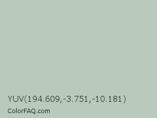 YUV 194.609,-3.751,-10.181 Color is a light green color and the nearest color is Powder Ash #bcc9c2. Hex code #b7cabb and RGB value is rgb(183,202,187). In RGB color space, this color is composed of 72% red, 79% green, 73% blue, In CMYK color space, this color is composed of 9% cyan, 0% magenta, 7% yellow , 21% black , In HSL color space, this color has a hue angle of 133° , 15% saturation and 75% lightness.
