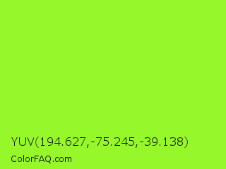 YUV 194.627,-75.245,-39.138 Color is a normal green color and the nearest color is Spring Frost #87ff2a. Hex code #96f72a and RGB value is rgb(150,247,42). In RGB color space, this color is composed of 59% red, 97% green, 16% blue, In CMYK color space, this color is composed of 39% cyan, 0% magenta, 83% yellow , 3% black , In HSL color space, this color has a hue angle of 88° , 93% saturation and 57% lightness.