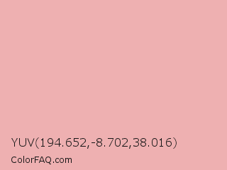 YUV 194.652,-8.702,38.016 Color is a very light red color and the nearest color is Shilo #e8b9b3. Hex code #eeb0b1 and RGB value is rgb(238,176,177). In RGB color space, this color is composed of 93% red, 69% green, 69% blue, In CMYK color space, this color is composed of 0% cyan, 26% magenta, 26% yellow , 7% black , In HSL color space, this color has a hue angle of 359° , 65% saturation and 81% lightness.