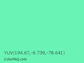 YUV 194.67,-6.739,-78.641 Color is a light green color and the nearest color is Medium Aquamarine #66ddaa. Hex code #69f3b5 and RGB value is rgb(105,243,181). In RGB color space, this color is composed of 41% red, 95% green, 71% blue, In CMYK color space, this color is composed of 57% cyan, 0% magenta, 26% yellow , 5% black , In HSL color space, this color has a hue angle of 153° , 85% saturation and 68% lightness.
