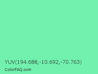 YUV 194.688,-10.692,-70.763 Color is a light green color and the nearest color is Medium Aquamarine #66ddaa. Hex code #72f0ad and RGB value is rgb(114,240,173). In RGB color space, this color is composed of 45% red, 94% green, 68% blue, In CMYK color space, this color is composed of 53% cyan, 0% magenta, 28% yellow , 6% black , In HSL color space, this color has a hue angle of 148° , 81% saturation and 69% lightness.