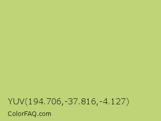 YUV 194.706,-37.816,-4.127 Color is a light lime color and the nearest color is Yellow Green #c5e17a. Hex code #bed476 and RGB value is rgb(190,212,118). In RGB color space, this color is composed of 75% red, 83% green, 46% blue, In CMYK color space, this color is composed of 10% cyan, 0% magenta, 44% yellow , 17% black , In HSL color space, this color has a hue angle of 74° , 52% saturation and 65% lightness.
