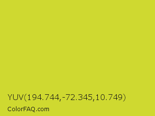 YUV 194.744,-72.345,10.749 Color is a normal yellow color and the nearest color is Pear #d1e231. Hex code #cfd930 and RGB value is rgb(207,217,48). In RGB color space, this color is composed of 81% red, 85% green, 19% blue, In CMYK color space, this color is composed of 5% cyan, 0% magenta, 78% yellow , 15% black , In HSL color space, this color has a hue angle of 64° , 69% saturation and 52% lightness.