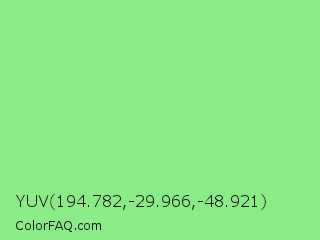 YUV 194.782,-29.966,-48.921 Color is a light green color and the nearest color is Light Green #90ee90. Hex code #8beb86 and RGB value is rgb(139,235,134). In RGB color space, this color is composed of 55% red, 92% green, 53% blue, In CMYK color space, this color is composed of 41% cyan, 0% magenta, 43% yellow , 8% black , In HSL color space, this color has a hue angle of 117° , 72% saturation and 72% lightness.