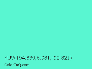 YUV 194.839,6.981,-92.821 Color is a light cyan color and the nearest color is Turquoise #40e0d0. Hex code #59f6d1 and RGB value is rgb(89,246,209). In RGB color space, this color is composed of 35% red, 96% green, 82% blue, In CMYK color space, this color is composed of 64% cyan, 0% magenta, 15% yellow , 4% black , In HSL color space, this color has a hue angle of 166° , 90% saturation and 66% lightness.