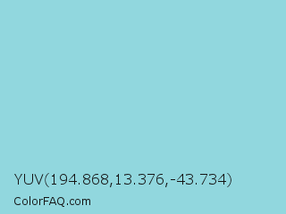 YUV 194.868,13.376,-43.734 Color is a light cyan color and the nearest color is Morning Glory #9edee0. Hex code #91d7de and RGB value is rgb(145,215,222). In RGB color space, this color is composed of 57% red, 84% green, 87% blue, In CMYK color space, this color is composed of 35% cyan, 3% magenta, 0% yellow , 13% black , In HSL color space, this color has a hue angle of 185° , 54% saturation and 72% lightness.