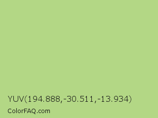 YUV 194.888,-30.511,-13.934 Color is a light green color and the nearest color is Feijoa #9fdd8c. Hex code #b3d785 and RGB value is rgb(179,215,133). In RGB color space, this color is composed of 70% red, 84% green, 52% blue, In CMYK color space, this color is composed of 17% cyan, 0% magenta, 38% yellow , 16% black , In HSL color space, this color has a hue angle of 86° , 51% saturation and 68% lightness.