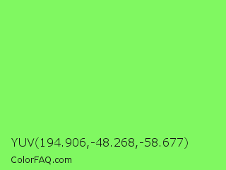 YUV 194.906,-48.268,-58.677 Color is a light green color and the nearest color is Screamin Green #66ff66. Hex code #80f861 and RGB value is rgb(128,248,97). In RGB color space, this color is composed of 50% red, 97% green, 38% blue, In CMYK color space, this color is composed of 48% cyan, 0% magenta, 61% yellow , 3% black , In HSL color space, this color has a hue angle of 108° , 92% saturation and 68% lightness.