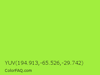 YUV 194.913,-65.526,-29.742 Color is a normal green color and the nearest color is Green Lizard #a7f432. Hex code #a1ee3e and RGB value is rgb(161,238,62). In RGB color space, this color is composed of 63% red, 93% green, 24% blue, In CMYK color space, this color is composed of 32% cyan, 0% magenta, 74% yellow , 7% black , In HSL color space, this color has a hue angle of 86° , 84% saturation and 59% lightness.