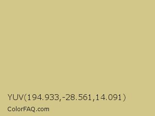 YUV 194.933,-28.561,14.091 Color is a light yellow color and the nearest color is Straw #d4bf8d. Hex code #d3c689 and RGB value is rgb(211,198,137). In RGB color space, this color is composed of 83% red, 78% green, 54% blue, In CMYK color space, this color is composed of 0% cyan, 6% magenta, 35% yellow , 17% black , In HSL color space, this color has a hue angle of 49° , 46% saturation and 68% lightness.