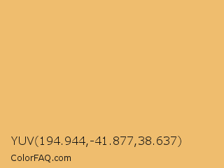 YUV 194.944,-41.877,38.637 Color is a light orange color and the nearest color is Rob Roy #eac674. Hex code #efbd6e and RGB value is rgb(239,189,110). In RGB color space, this color is composed of 94% red, 74% green, 43% blue, In CMYK color space, this color is composed of 0% cyan, 21% magenta, 54% yellow , 6% black , In HSL color space, this color has a hue angle of 37° , 80% saturation and 68% lightness.