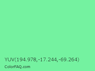 YUV 194.978,-17.244,-69.264 Color is a light green color and the nearest color is Medium Aquamarine #66ddaa. Hex code #74f2a0 and RGB value is rgb(116,242,160). In RGB color space, this color is composed of 45% red, 95% green, 63% blue, In CMYK color space, this color is composed of 52% cyan, 0% magenta, 34% yellow , 5% black , In HSL color space, this color has a hue angle of 141° , 83% saturation and 70% lightness.