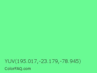 YUV 195.017,-23.179,-78.945 Color is a light green color and the nearest color is Very Light Malachite Green #64e986. Hex code #69fa94 and RGB value is rgb(105,250,148). In RGB color space, this color is composed of 41% red, 98% green, 58% blue, In CMYK color space, this color is composed of 58% cyan, 0% magenta, 41% yellow , 2% black , In HSL color space, this color has a hue angle of 138° , 94% saturation and 70% lightness.