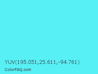YUV 195.051,25.611,-94.761 Color is a light cyan color and the nearest color is Turquoise Blue #6cdae7. Hex code #57f0f7 and RGB value is rgb(87,240,247). In RGB color space, this color is composed of 34% red, 94% green, 97% blue, In CMYK color space, this color is composed of 65% cyan, 3% magenta, 0% yellow , 3% black , In HSL color space, this color has a hue angle of 183° , 91% saturation and 65% lightness.