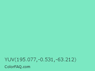 YUV 195.077,-0.531,-63.212 Color is a light green color and the nearest color is Bermuda #7dd8c6. Hex code #7be8c2 and RGB value is rgb(123,232,194). In RGB color space, this color is composed of 48% red, 91% green, 76% blue, In CMYK color space, this color is composed of 47% cyan, 0% magenta, 16% yellow , 9% black , In HSL color space, this color has a hue angle of 159° , 70% saturation and 70% lightness.