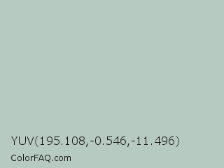 YUV 195.108,-0.546,-11.496 Color is a light green color and the nearest color is Powder Ash #bcc9c2. Hex code #b6cac2 and RGB value is rgb(182,202,194). In RGB color space, this color is composed of 71% red, 79% green, 76% blue, In CMYK color space, this color is composed of 10% cyan, 0% magenta, 4% yellow , 21% black , In HSL color space, this color has a hue angle of 156° , 16% saturation and 75% lightness.