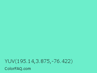 YUV 195.14,3.875,-76.422 Color is a light cyan color and the nearest color is Aquamarine #7fffd4. Hex code #6ceecb and RGB value is rgb(108,238,203). In RGB color space, this color is composed of 42% red, 93% green, 80% blue, In CMYK color space, this color is composed of 55% cyan, 0% magenta, 15% yellow , 7% black , In HSL color space, this color has a hue angle of 164° , 79% saturation and 68% lightness.