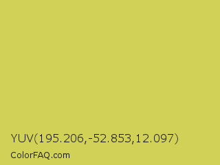 YUV 195.206,-52.853,12.097 Color is a normal yellow color and the nearest color is Tacha #d6c562. Hex code #d1d158 and RGB value is rgb(209,209,88). In RGB color space, this color is composed of 82% red, 82% green, 35% blue, In CMYK color space, this color is composed of 0% cyan, 0% magenta, 58% yellow , 18% black , In HSL color space, this color has a hue angle of 60° , 57% saturation and 58% lightness.