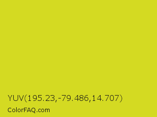 YUV 195.23,-79.486,14.707 Color is a normal yellow color and the nearest color is Barberry #ded717. Hex code #d4da22 and RGB value is rgb(212,218,34). In RGB color space, this color is composed of 83% red, 85% green, 13% blue, In CMYK color space, this color is composed of 3% cyan, 0% magenta, 84% yellow , 15% black , In HSL color space, this color has a hue angle of 62° , 73% saturation and 49% lightness.